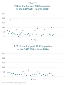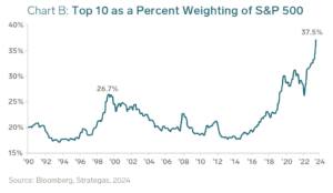 Another way to look at market breadth, or lack of it, is to compare the returns of the S&P 500 Index with the Equal Weight S&P 500 Index. The commonly cited S&P 500 Index is market-cap weighted, which means larger companies have larger index weights and greater influence on return. Conversely, in the S&P 500 Equal Weight Index all constituents have the same weight regardless of company size and have equal influence on return. The market-cap weighted S&P 500 returned 15.1% for the first half of 2024; the equal weight index returned just 5.1%. (See Chart A: 2024 Year-To-Date Performance, S&P 500 Market Cap vs Equal Weight)