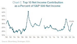 Tremendous concentration remains a concern as a select group of tech stocks still drive market returns. These mega-cap technology leaders are rising on hopes that the transformative nature of AI will create massive earnings growth. We are led to believe we shouldn’t worry about concentration or valuation because the moats around these large tech companies are so strong and the promise of AI so extraordinary.