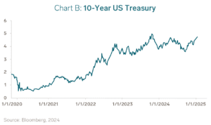 Chart A shows how the proposed Trump tariffs compare to US tariff history. Tariffs of 10% or 20% across the board would be highly inflationary. It’s encouraging that formal administration roles have generally gone to mainstream financial professionals rather than tariff extremists. For example, Trump named Scott Bessent his nominee for the Treasury Secretary position. Bessent is a respected macro investor with a firm understanding of economic dynamics.