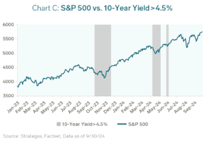 Our colleagues at Strategas Research Partners have compiled data showing that when the 10-year Treasury yield hits about 4.5%, it pressures equity prices, and stocks may pull back. US stocks are not priced for that pressure right now; they are priced for low volatility, declining inflation, and 3%-4% yields in the bond market. Anything outside those bounds could spike volatility — for example, if earnings slump or the Trump administration makes a policy error. If the 10-year Treasury yield pushes against 5%, I don’t think markets can stay where they are.