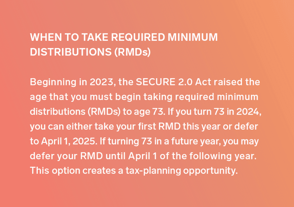 Take RMDs/QCDs. You’ll incur steep penalties if you don’t take required minimum distributions from your tax deferred retirement accounts — such as 401(k)s and traditional IRAs — by December 31, 2024. For taxable RMDs that you don’t need for living expenses, you may wish to take a qualified charitable distribution of up to $105,000 instead. That money won’t be included in your annual adjusted gross income and could be part of your overall philanthropic giving.
