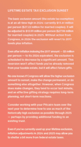 Take advantage of annual exclusion gifts. If you haven’t used up your annual exclusion gifts, now is the time. Individuals can give up to $18,000 per recipient, without a limit on the number of recipients, in 2024. These can be cash gifts, but in some cases, it could make sense to give investment assets that have high growth potential.